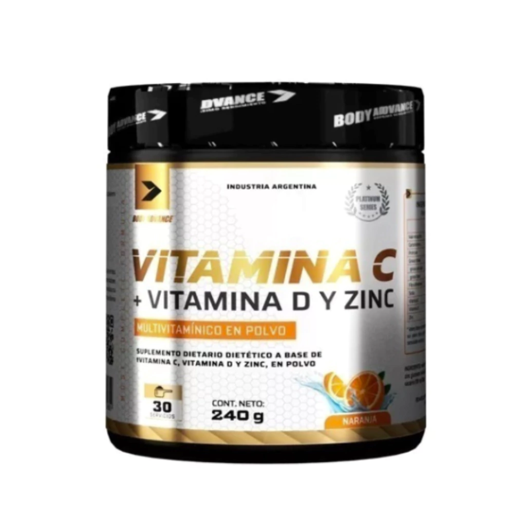 Suplemento dietario en polvo a base de Vitamina C, Vitamina D y Zinc con sabor naranja. Potente fórmula antioxidante que contribuye al crecimiento y reparación de tejidos, fortalece el sistema inmunológico y favorece la absorción de calcio para la salud ósea. El zinc apoya la función inmune y la síntesis proteica.