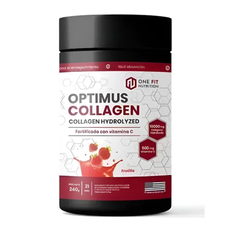 Colágeno Optimus de One Fit, fórmula avanzada en polvo de 240g con Colágeno Hidrolizado, Vitamina C y minerales esenciales. El colágeno hidrolizado mejora la salud de articulaciones, tendones, ligamentos y piel. La adición de Vitamina C potencia la síntesis natural de colágeno endógeno. Ideal para deportistas que buscan proteger sus articulaciones y mejorar la recuperación de tejidos conectivos.
