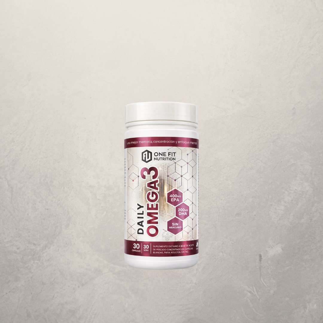 Omega 3 de One Fit en cápsulas blandas de 1000mg de aceite de pescado purificado, presentación de 30 comprimidos. Aporta ácidos grasos esenciales EPA y DHA que contribuyen al mantenimiento de la función cardíaca normal, reducen los triglicéridos en sangre y tienen propiedades antiinflamatorias. Ideal para deportistas que buscan optimizar la recuperación muscular y la salud cardiovascular.
